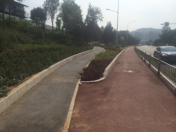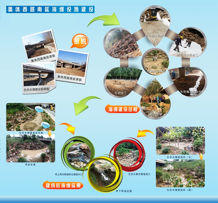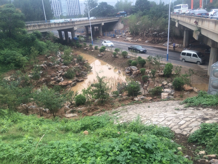 奧體西路南延原為斷頭路,道路紅線范圍及東西側(cè)空間原狀均為荒地,旅游路北橋北側(cè)原為大辛河支溝上游河道。結(jié)合本次奧體西路南延道路工程建設,充分落實海綿城市建設理念,重點對橋下空間因地制宜進行挖潛,精心設計建設了1500余平方的生態(tài)水塘、植草溝、旱溪等海綿工程設施。通過對旅游路部分路段雨水進行斷接,使上游區(qū)域雨水先進入生態(tài)水塘等設施進行生態(tài)凈化和下滲,滲后多余的雨水再溢流進入大辛河支溝,徹底改變了該路段原有的雨水直排模式。